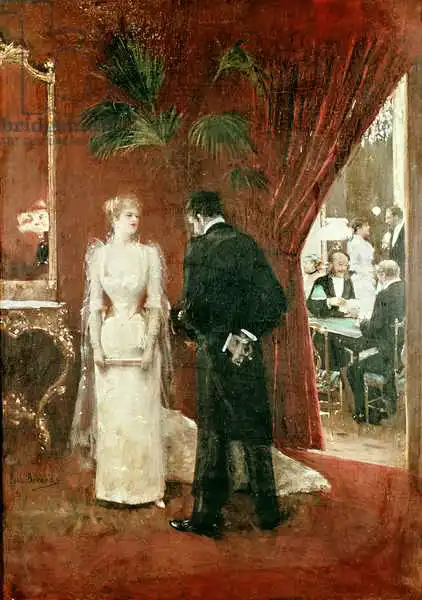 Béraud namaloval obraz Private Conversation v roce 1904. Převládající barvy tohoto obrazu jsou do hněda a jeho formát je na výšku. Rozměr originálu je 69x49. Umístěním originálu obrazu je J. Kugel Collection, Paris, France. Reprodukci tohoto obrazu tiskneme na přání - můžete si zvolit rozměr i provedení reprodukce.