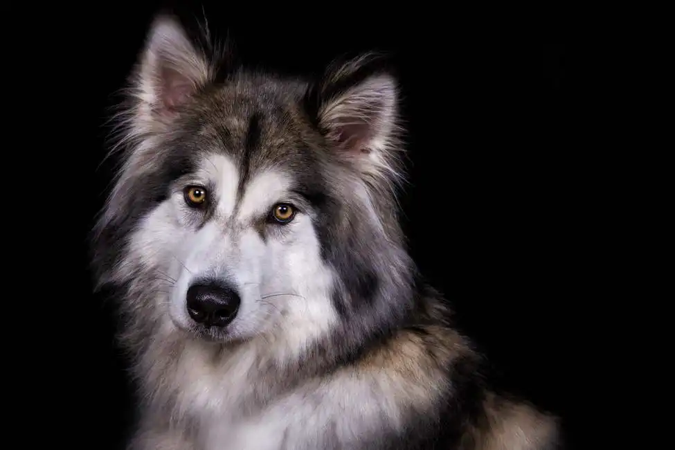Na obrázku je portrét majestátního psa, který vypadá jako vlk. Pes má hustou a vzorovanou srst s převahou hnědých a šedých odstínů. Jeho oči jsou pronikavě žluté s výrazným pohledem. Snímek byl pořízen na tmavém pozadí, díky čemuž se zdůrazňují obličejové rysy a barevné detaily srsti. Pes vypadá ušlechtilý a klidný, s ostražitým výrazem typickým pro vlčí příbuzné.