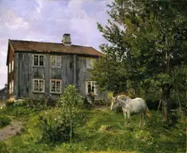 Za ní se ohlíží hlídací psík, který má ovšem přehled. Obraz má krásnou letní atmosféru. Brendekilde namaloval obraz Venkovský dům s loukou v roce 1909. Převládající barvy tohoto obrazu jsou do zelena a jeho formát je na šířku. Reprodukci tohoto obrazu tiskneme na přání - můžete si zvolit rozměr i provedení reprodukce.
