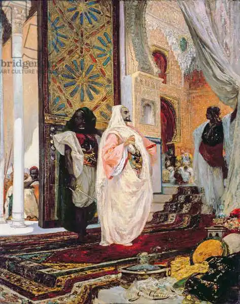 Clairin namaloval obraz Entering the Harem v roce 1870s. Převládající barvy tohoto obrazu jsou do zelena a jeho formát je na výšku. Rozměr originálu je 81.9x65. Umístěním originálu obrazu je Walters Art Museum, Baltimore, USA. Reprodukci tohoto obrazu tiskneme na přání - můžete si zvolit rozměr i provedení reprodukce.