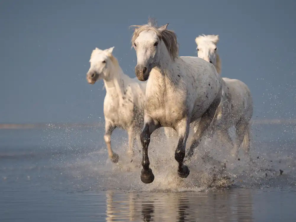 #zvířata #koně #francie #camargue #cval #rychle #ruh #běh #špláchnutí #akce #voda #pláž #břeží #pobřeží #trio #jezdec #evropa #písek #krajina #pláže #mořské pobřeží #moře