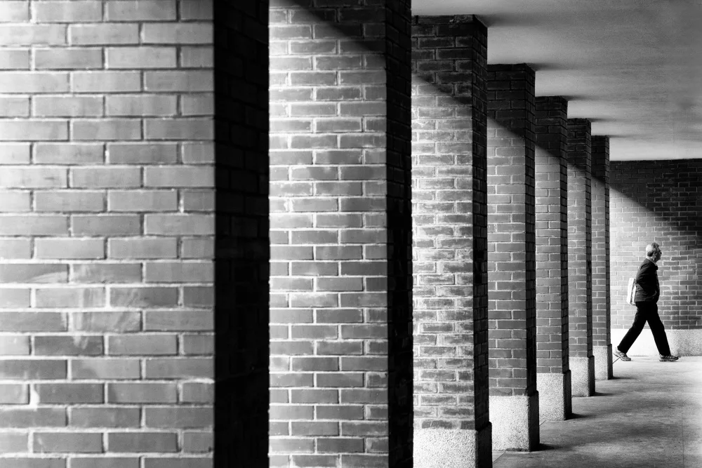 #slunce #stín #sloupy #muž #cházka #ulice #město #cihly #vpravo