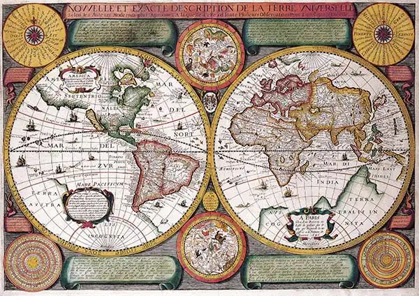 Boisseau namaloval obraz Historická mapa světa 1646 v roce 1646. Převládající barvy tohoto obrazu jsou pestrobarevné a jeho formát je na šířku. Reprodukci tohoto obrazu tiskneme na přání - můžete si zvolit rozměr i provedení reprodukce.