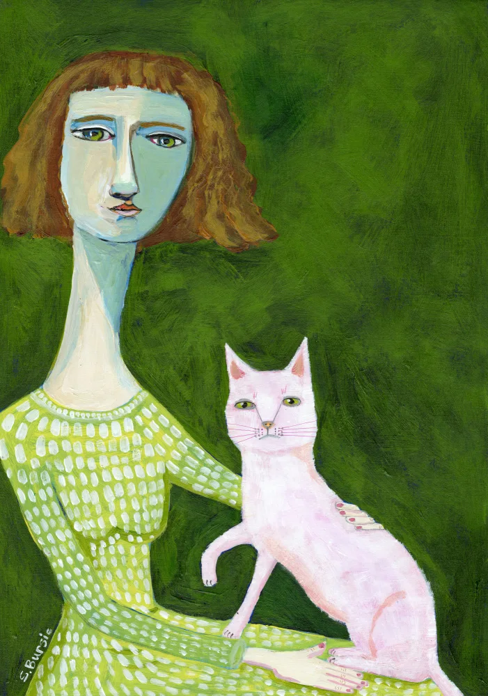 #dáma #žena #naivní dáma #naivní žena #dáma a kočka #bílá kočka #jarovné umění #figurativa #dáma v zelených šatech #kočičí dáma #šílená kočičí lady #vintage lady #vintage žena #člověk #lidi #sharyn bursic #graphustilla #zelená #kočka #kočky #mazlíček #mazlíčka #zvíře #zvířata #malování #malované #barva #malířské #sedění #podpisy