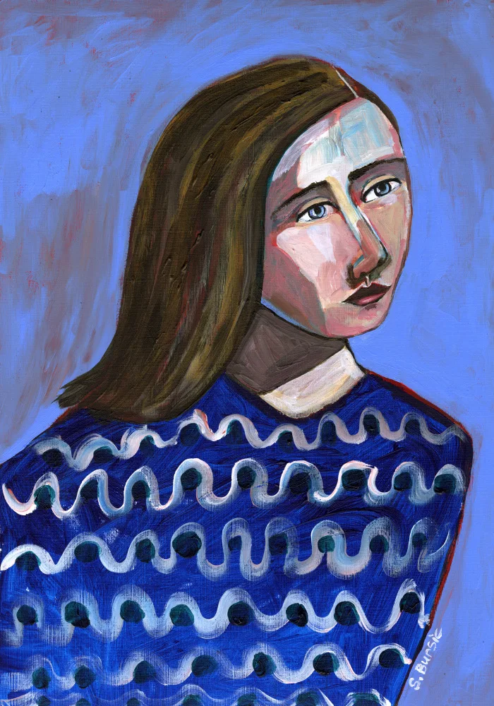 Žena v modrém svetru naivní portrét figurativní
