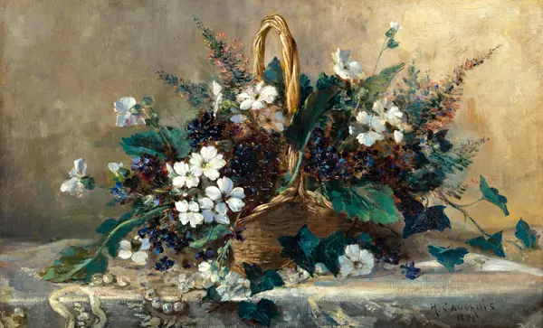Cauchois namaloval obraz Proutěný košík se sněhovým květem a fialkami v roce 1878. Převládající barvy tohoto obrazu jsou pestrobarevné a jeho formát je na šířku. Rozměr originálu je 61 x 38 cm. Reprodukci tohoto obrazu tiskneme na přání - můžete si zvolit rozměr i provedení reprodukce.