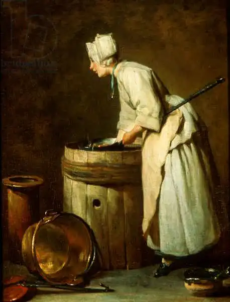 Chardin namaloval obraz Scullery Maid v roce 1738. Převládající barvy tohoto obrazu jsou do hněda a jeho formát je na výšku. Rozměr originálu je 46.9x38.1. Umístěním originálu obrazu je Corcoran Collection, National Gallery of Art, Washington D.C., USA. Reprodukci tohoto obrazu tiskneme na přání - můžete si zvolit rozměr i provedení reprodukce.