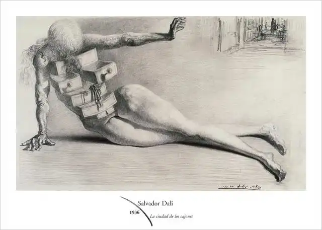 Obrázek zobrazuje uměleckou kresbu od Salvadora Dalího s názvem „La ciudad de los cajones“. Na kresbě je nahá lidská postava s truhlicemi namísto trupu v surrealistickém stylu. Postava má výrazně vypracované svaly, je zobrazena v pohybu a je na půl cesty skrz dveřní rám. Pozadí kresby naznačuje stěny a podlahu interiéru s otevřenými dveřmi v dálce.