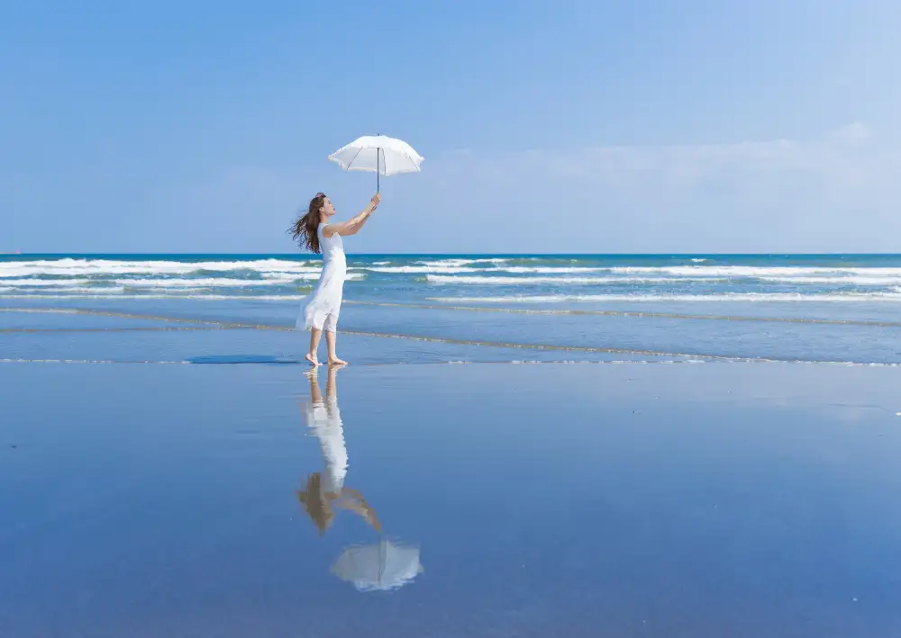 #dívka #modelka #deštník #pláž #pobřeží #voda #odraz #portrét #venku #japonsko