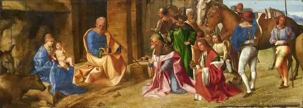 Giorgione namaloval obraz Klanění tří králů v roce 1490. Převládající barvy tohoto obrazu jsou do hněda a jeho formát je podlouhlý. Rozměr originálu je 29.8x81.3. Umístěním originálu obrazu je National Gallery, London, UK. Reprodukci tohoto obrazu tiskneme na přání - můžete si zvolit rozměr i provedení reprodukce.