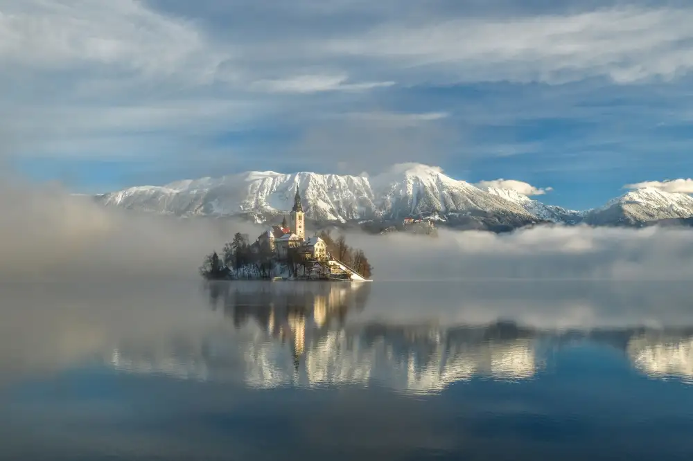 #hory #voda #jezero #sníh #zima #kostel #ostrov #odraz #mlha #krajina #nebe #oblačnost #oblaky #jezera #chlad #mráz #zamrznutý #sněžení #ráno #svítání #slunce #cestování #klid #stál #harmonie #turistika