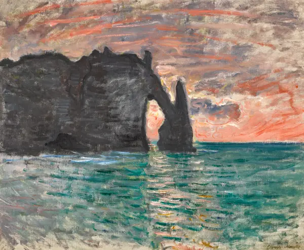Monet namaloval obraz Étretat, západ slunce v roce 1883. Převládající barvy tohoto obrazu jsou do červena a jeho formát je na šířku. Rozměr originálu je 73,7 x 60,2 cm. Obraz je umístěn v soukromé sbírce. Reprodukci tohoto obrazu tiskneme na přání - můžete si zvolit rozměr i provedení reprodukce.