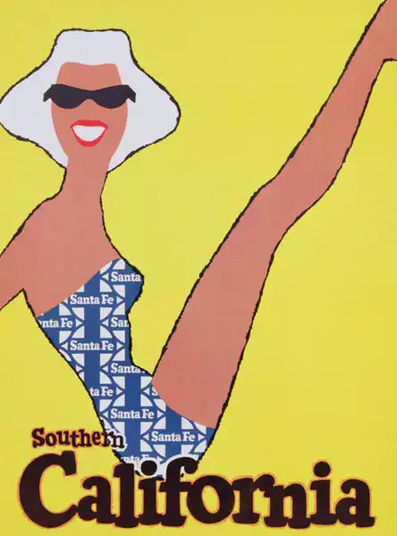 Na obrázku je stylizované zobrazení ženy v plavkách s nápisem "Santa Fe", který se opakuje a vytváří vzor na plavkách. Žena má na sobě také bílý široký klobouk a černé sluneční brýle. Pozadí obrázku je žluté a dole je nápis "Southern California" ve velkém, tučném písmu. Celkově má obrázek retro nádech a může být reklamním plakátem nebo uměleckým dílem.