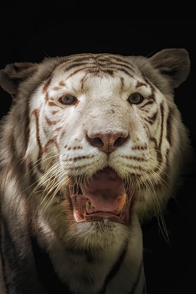 #zvíře #tygr #zvířata #tygři #kočkařská #ústa #bílý tygr #bílí tygři #divočina #příroda #řev #vyraz #tesky #zlok #hněv #agrese #agresivní #v tvář #portrét #zblízka #černé pozadí #tmavé pozadí #žádné pozadí #jednotlivé pozadí #fouzy