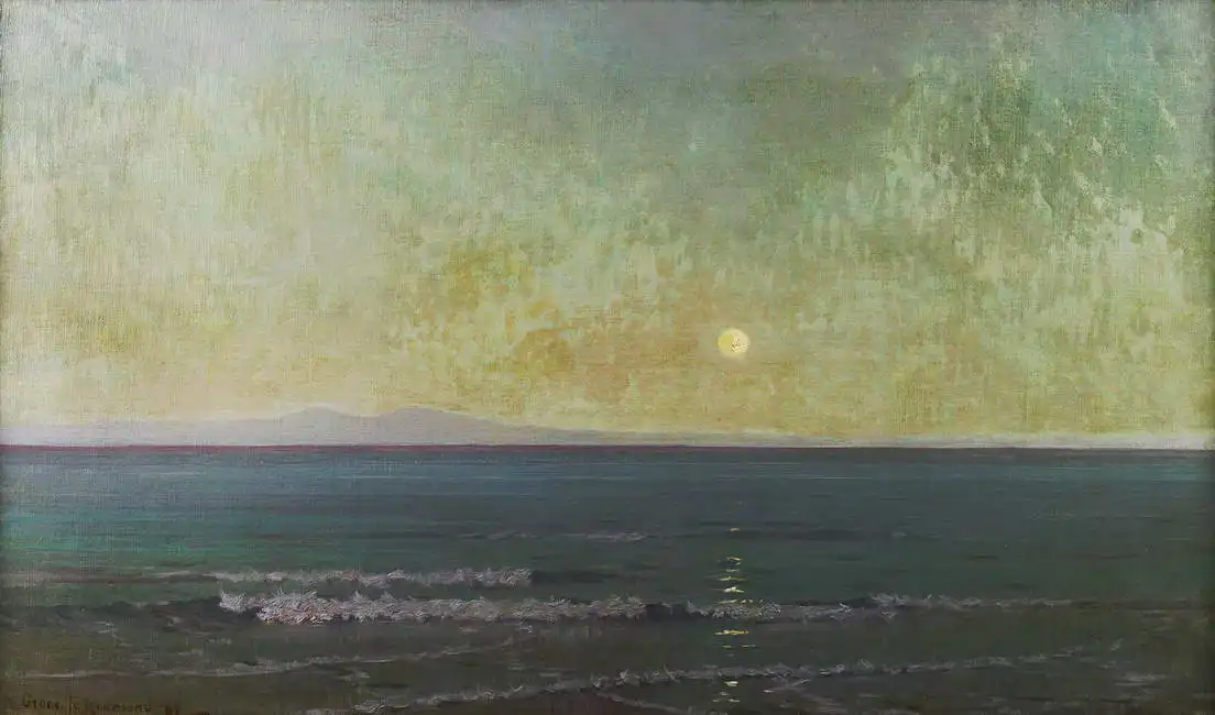 Obrázek znázorňuje klidný mořský výjev s pláží a nízkým horizontem. Nebe je v závěru dne zbarveno do různých odstínů žluté a zelené, a slunce pomalu zapadá nad vodní hladinu, čímž na moři vzniká odlesk. Ve vodě jsou vidět jemné vlny, a díky klidné atmosféře působí scéna velice mírumilovně a meditativně. Tento obraz je malovaný olejovými barvami a představuje typický příklad impresionistického stylu.