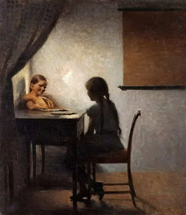 Tento obraz zobrazuje dvě osoby sedící proti sobě u dřevěného stolu v interiéru, který je osvětlen ze strany, což vytváří hru stínů na stěně. Osoba v popředí, která sedí zády k divákovi, se zdá být ve světlých oděvech a zaměřená na to, co má před sebou na stole. Druhá osoba naproti se usmívá a je mírně natočená do strany. Obě osoby mohou být ženského pohlaví či děti.
