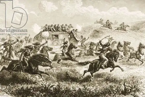 Anglická škola (19. století) namaloval obraz Carrying United States Mail Across the Sierra Nevada in 1860, from American Pictures v roce 1876. Převládající barvy tohoto obrazu jsou do zelena a jeho formát je na šířku. Obraz je umístěn v soukromé sbírce. Reprodukci tohoto obrazu tiskneme na přání - můžete si zvolit rozměr i provedení reprodukce.
