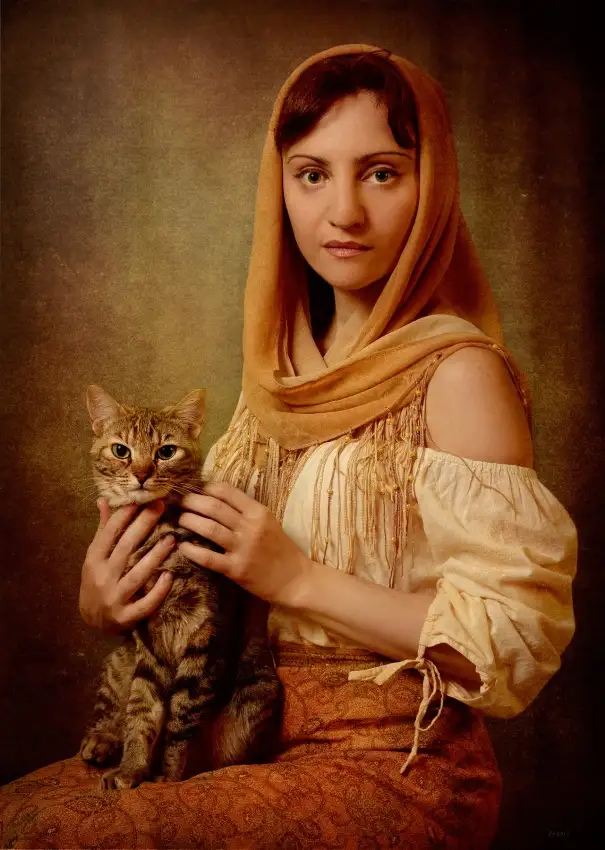 #kočka #starý #žena #portrét #člověk #lidé #kočky #mazlíček #mazlíčka #zvíře #zvířata #figurativní #závoj #šátek #dívka #modelka #obličák #tónované #studium