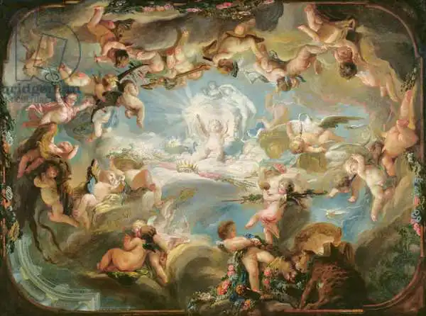 Saint-Aubin namaloval obraz Triumph of Cupid over all the Gods v roce 1752. Převládající barvy tohoto obrazu jsou do zelena a jeho formát je na šířku. Rozměr originálu je 97x129. Umístěním originálu obrazu je Musee des Beaux-Arts, Rouen, France. Reprodukci tohoto obrazu tiskneme na přání - můžete si zvolit rozměr i provedení reprodukce.