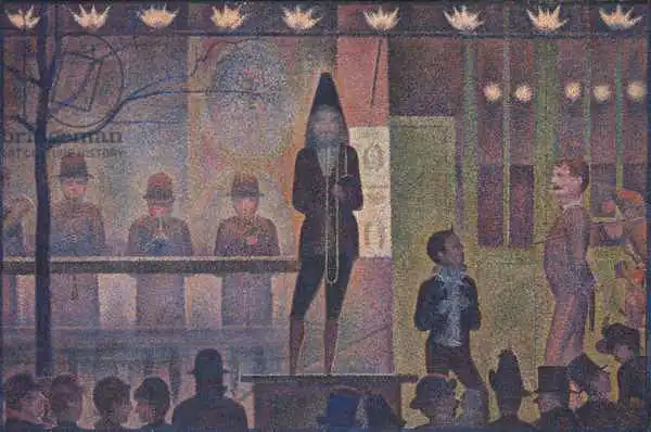 Seurat namaloval obraz Circus Sideshow (Parade de cirque) v roce 1887-88. Převládající barvy tohoto obrazu jsou do zelena a jeho formát je na šířku. Rozměr originálu je 99.7x149.9. Umístěním originálu obrazu je Metropolitan Museum of Art, New York, USA. Reprodukci tohoto obrazu tiskneme na přání - můžete si zvolit rozměr i provedení reprodukce.
