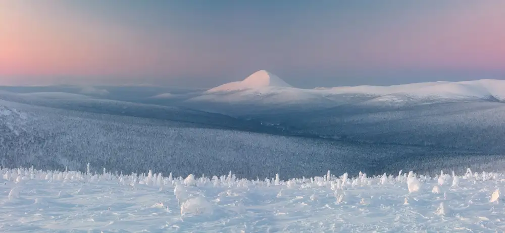 #růžová #hora koip #výchoz slunce #ráno #svítání #zima #rozba #krajina #hory #vrchol #zasněný peak #vrch #urál #rusko