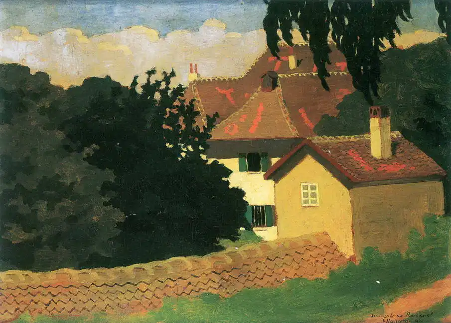 Obraz zachycuje venkovský dům obklopený zelení a stromy. Má červenou střechu a bílé fasády se světlými okny. V pozadí jsou vidět stromy a obloha s načervenalými mraky, což naznačuje možný západ slunce. Styl malby je impresionistický s volnými tahy štětcem a měkkými přechody barev. Atmosféra obrazu vyvolává pocit klidu a idylického venkovského života.