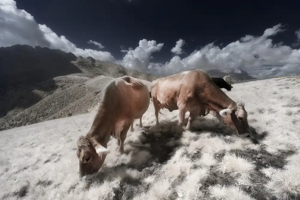 #kráva #krávy #venkova #infrarevné #hory #zvíře #zvířata #hovot #hospodářství #farma #pastorské #pole #krajina #jedání #filtr #trava #mraky #obloha